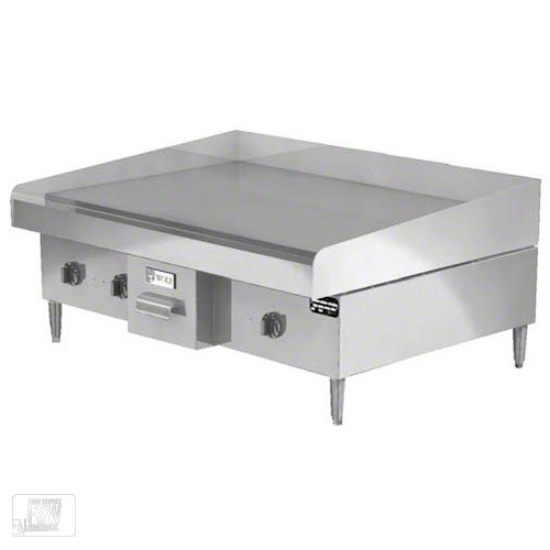 The 36” Electric Griddle (WEG36D) by Vulcan-Hart is a deep spacesaver griddle with all the beneficial features of a larger model. This smaller model is deeper than its 36 inch counterpart, and has the ability to produce approximately 60 three-inch hamburgers or 40 four-inch pancakes per load. The griddle is stainless steel with a ½ inch thick griddle plate made from polished steel for a smooth and even cooking surface. One solid sheathed tubular incoloy heating element, thermostat, and cycling light is allotted for each 12 inches of griddle space to ensure a controlled cooking experience with the ability to set a different temperature for each side of the griddle when necessary. A stainless steel splash guard rises to 4 inches in the back of the unit and tapers down to 2 inches near the front to help keep the workspace clean and hold grease on the griddle. A 3 1/8 inch grease trough is placed on the front of the griddle to make for easy and hassle-free cleanup. Features: 4 inch adjustable legs, Fully stainless steel composition, Large 36" x 27. 6" griddle plate workspace, 1/2 inch polished steel griddle plate heats quickly and evenly. Benefits: 3 1/8 inch grease trough makes for easy and fast cleanup and holds up to 1. 5 gallons of grease, Tapered 2" - 4" splash grants larger working mobility while maintaining a clean workspace, Three adjustable thermostats from 200° - 450° Fahrenheit allows more control over different griddle portions. Additional Comments: One year limited parts and labor warranty, Please call a representative to specify voltage and phase when ordering, For additional options and accessories, contact a sales representative at 1-877-877-4379 Monday through Friday 6: 30am – 6: 00pm MST. .